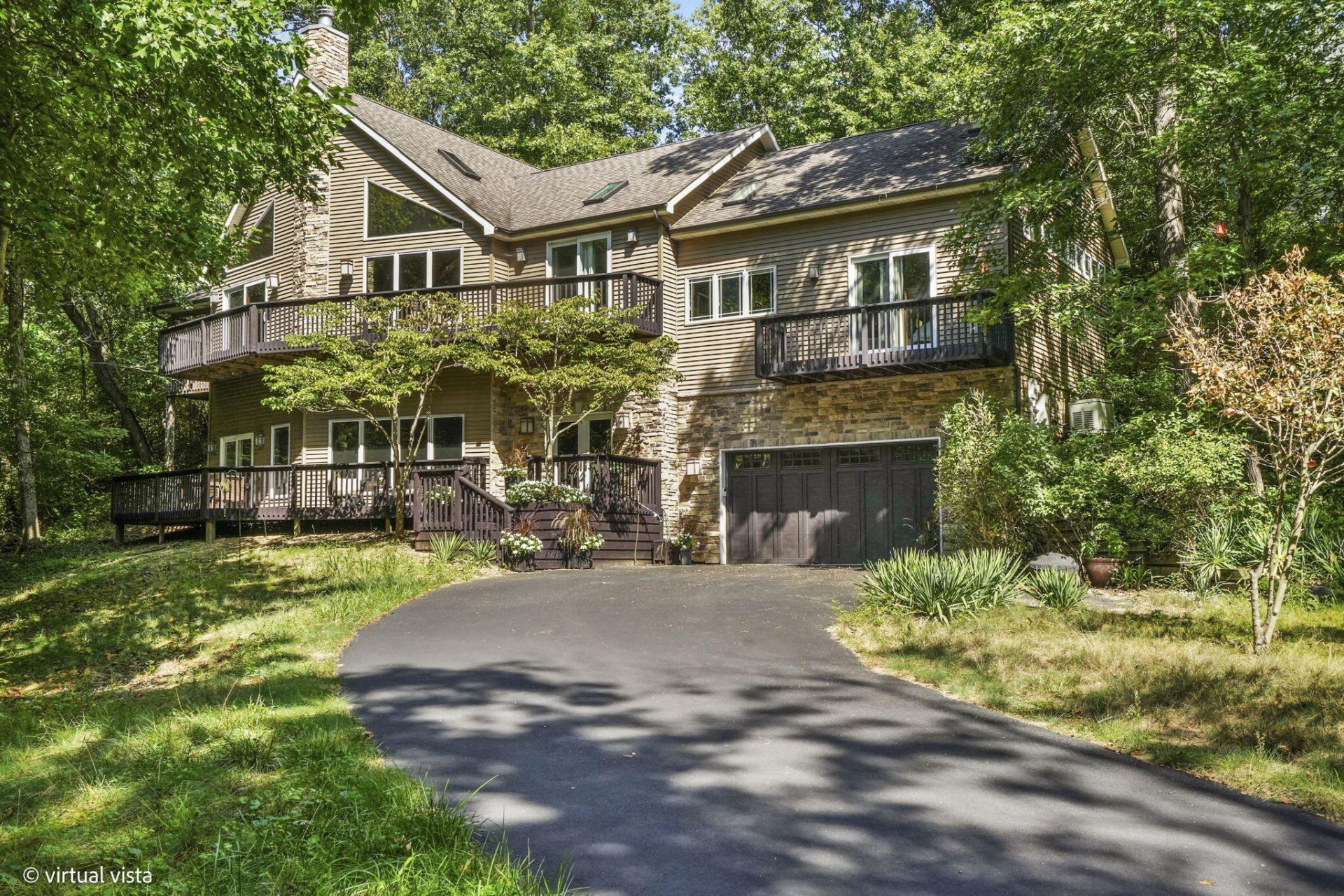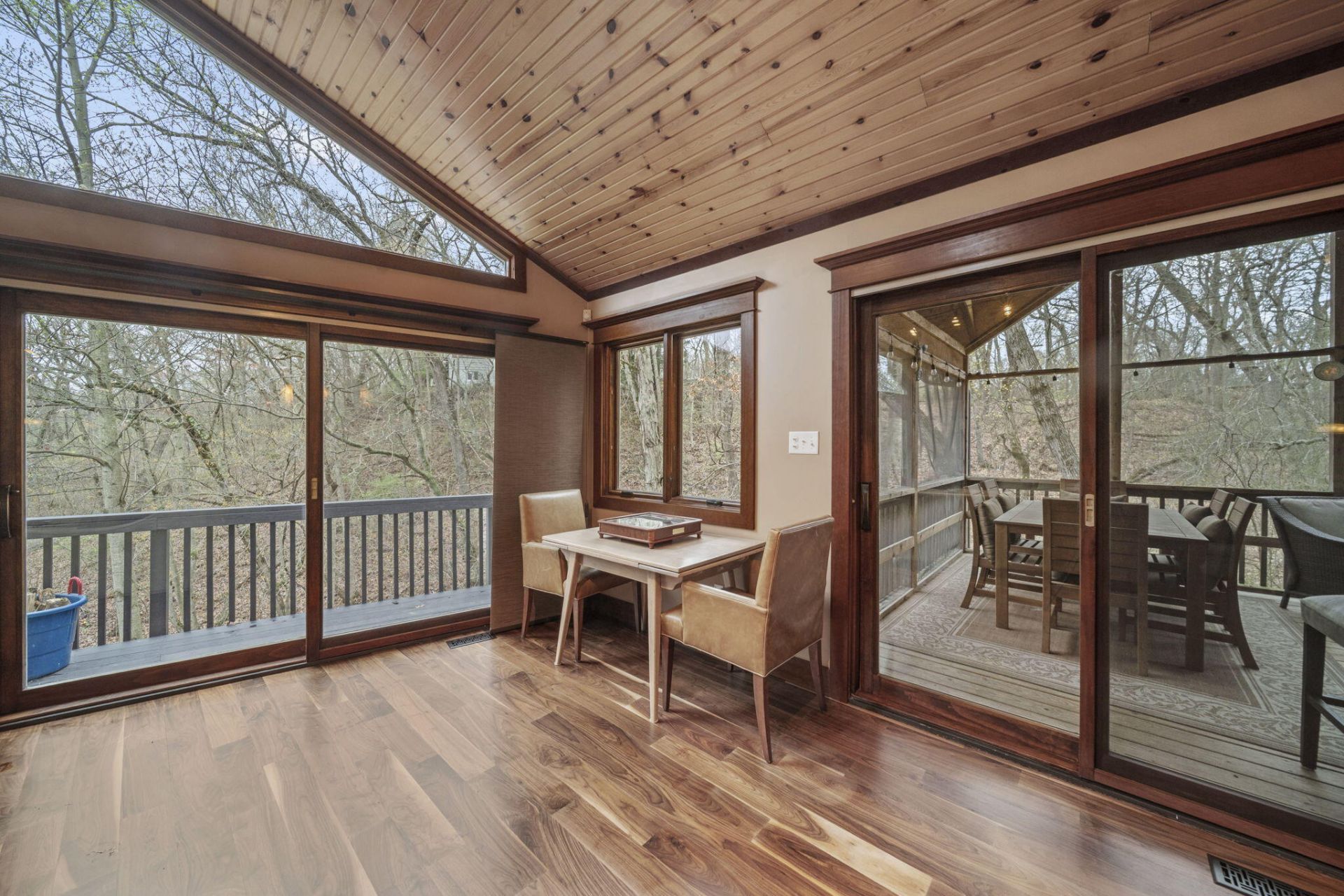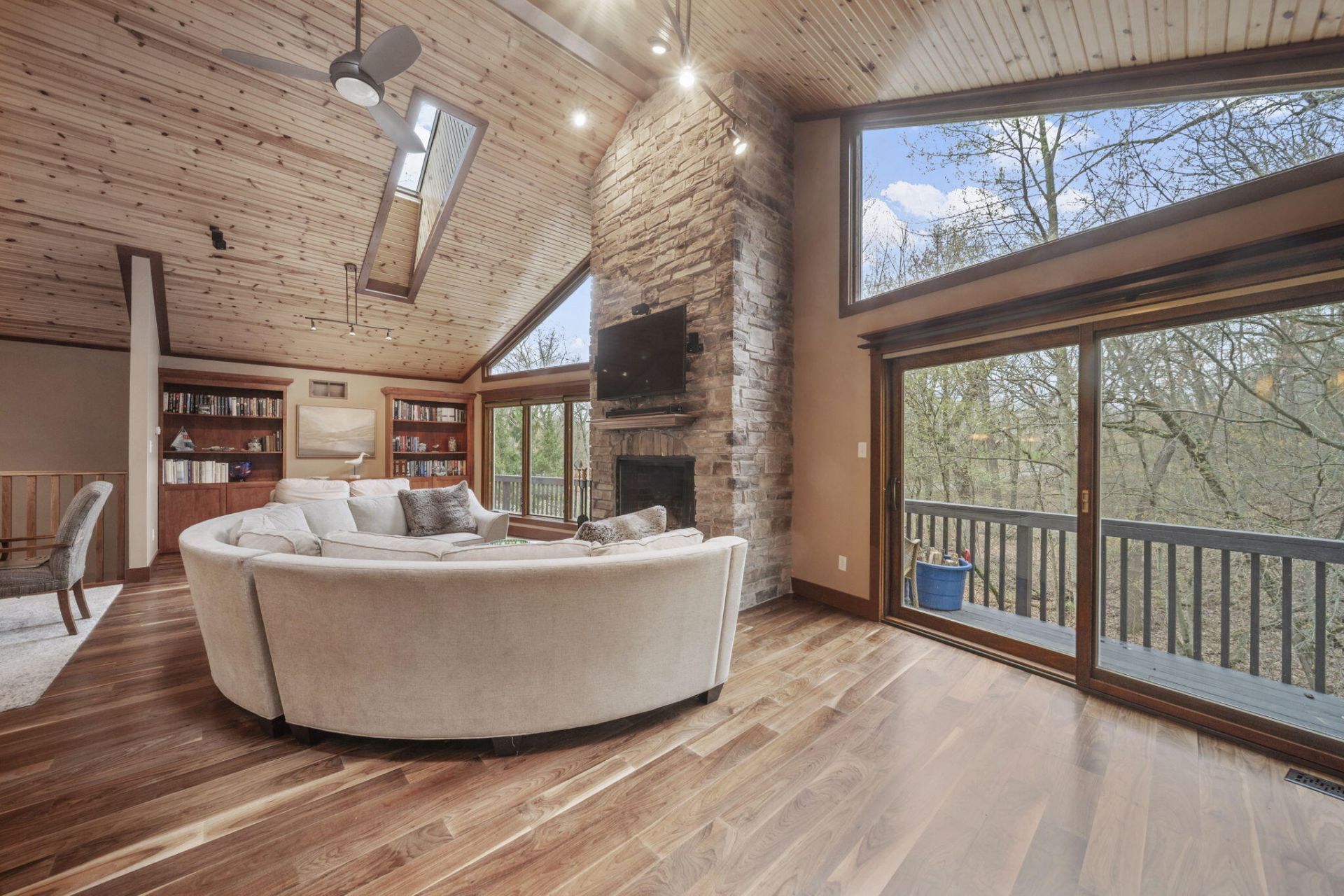 This 4BED/3.5BATH luxury home is set high against a dune, surrounded by native landscaping and undeveloped forest, offering exceptional privacy. Wraparound porches and balconies overlook a lush yard and private ravine. With 3,790 square feet of living space, this retreat features bright, open rooms with twelve-foot ceilings, tall windows, and skylights showcasing beautiful, unobstructed views. A dramatic entry with a custom walnut staircase leads to an expansive dining area accommodating twelve, while the great room opens to a screened porch perched above the scenic dune ravine. A dramatic cathedral height stone fireplace anchors the living, dining, and kitchen areas in a stunning great room with large skylights, a wall of windows, built-in bookshelves, a natural wood ceiling, and gorgeous wide plank premium walnut floors. A private 2nd-Floor Guest Suite with its own bath provides an ideal escape, and two nearby beaches with golf cart and car parking complete the coastal lifestyle!